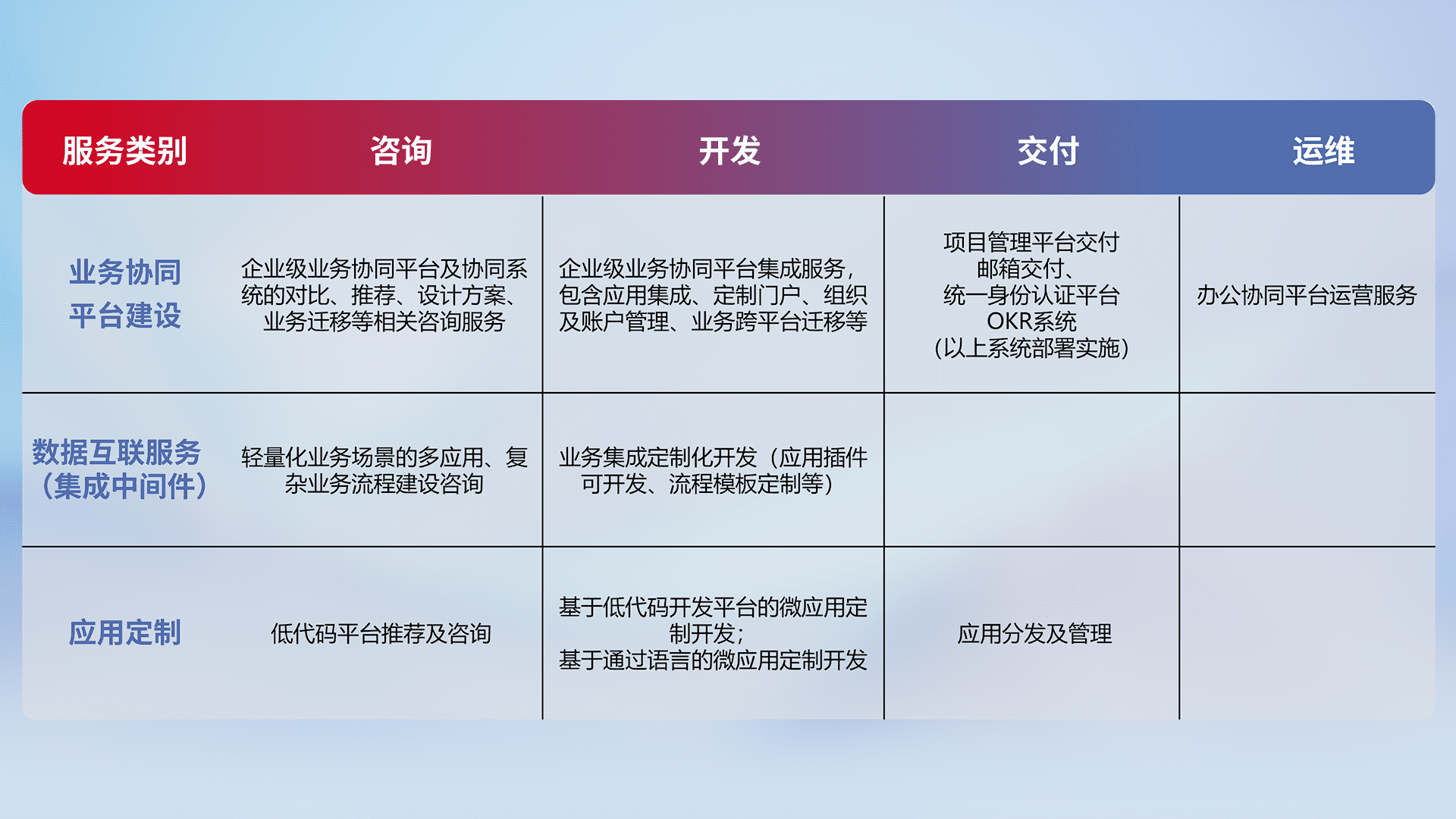 针对钉钉、、、、企微、、、、IDaas等平台级产品提供产品的规划、、、、方案、、交付、、定制化开发等服务,,,,实现如统一协同办公、、、、智能客户服务、、混合会议管理、、、、智能数据查询、、、、等业务场景,,实现数字化转型。。。。