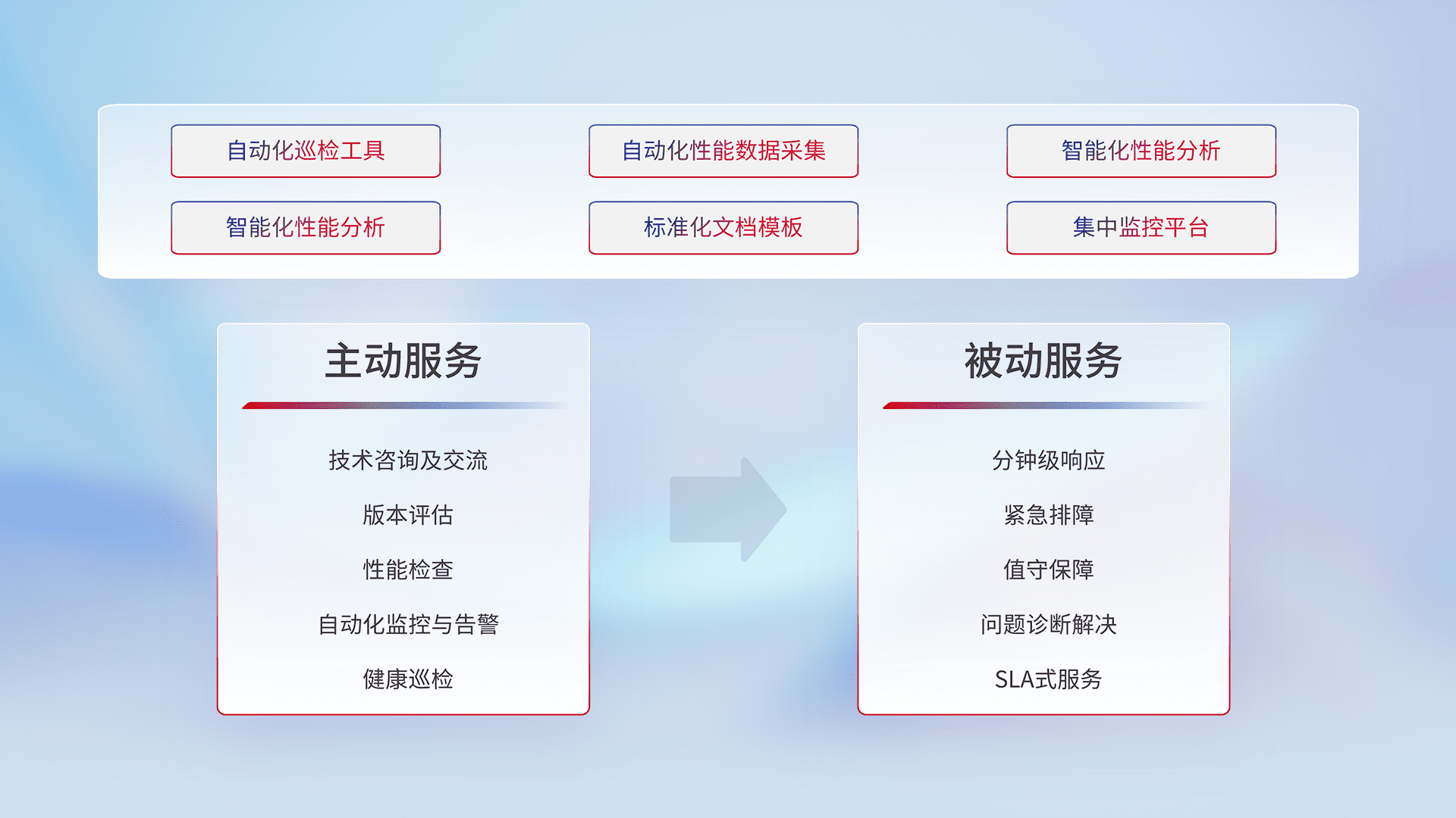 智能化工具和标准化文档,,,保障服务质量,,,,提供主动服务(包含技术咨询、、、、版本评估、、、性能检查、、自动化监控与告警、、健康巡检)和被动服务包含(分钟级响应、、、紧急排障、、、值守保障、、问题诊断解决、、SLA服务)。。